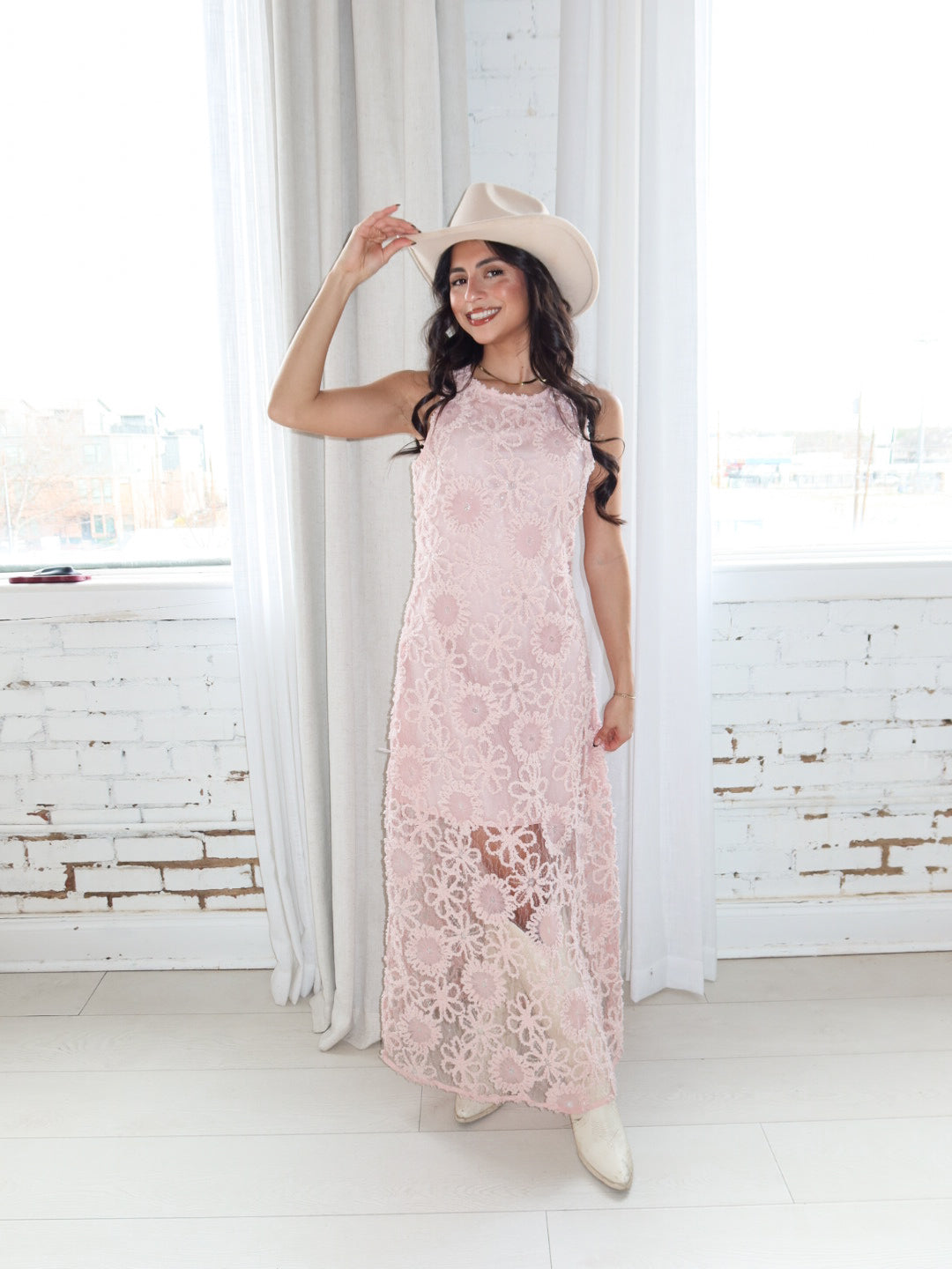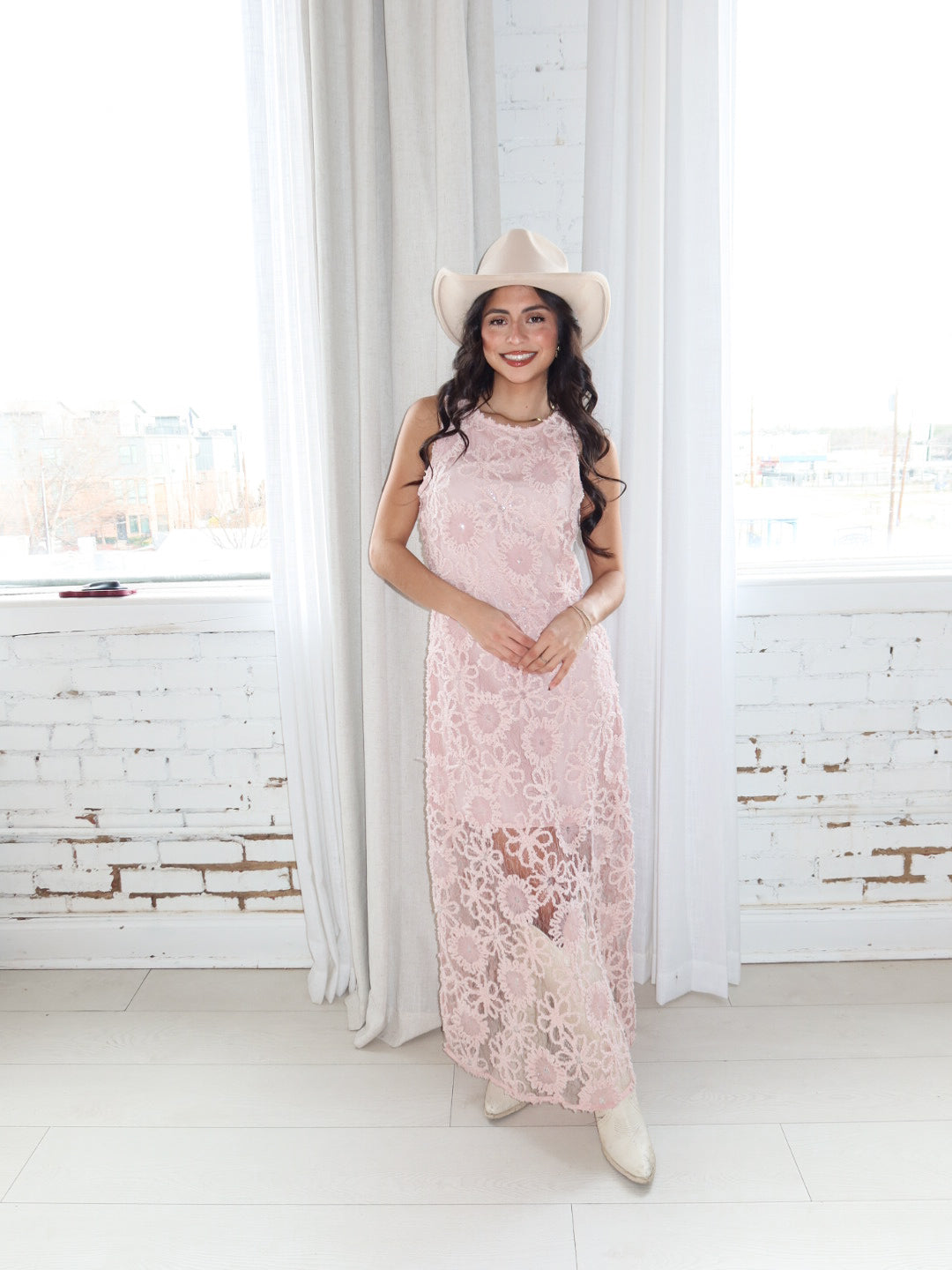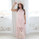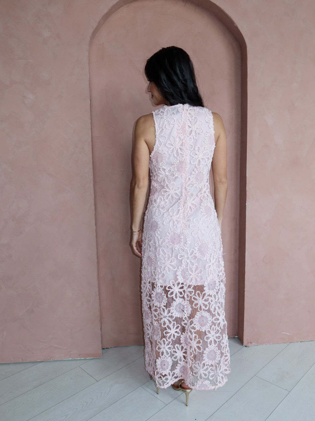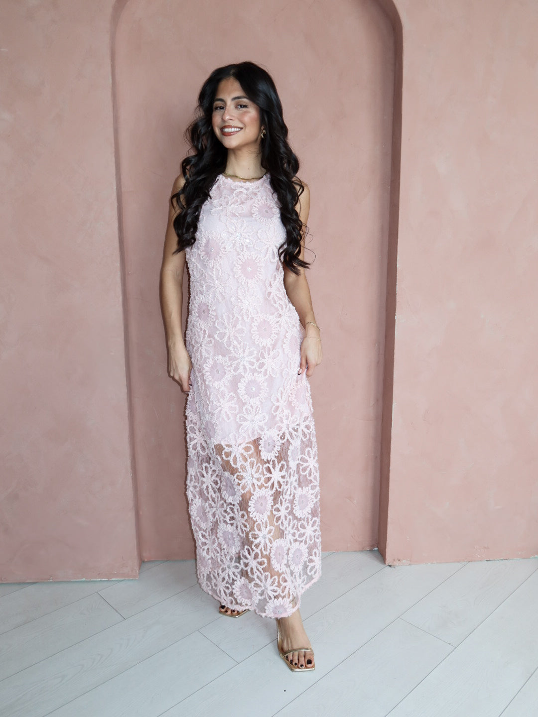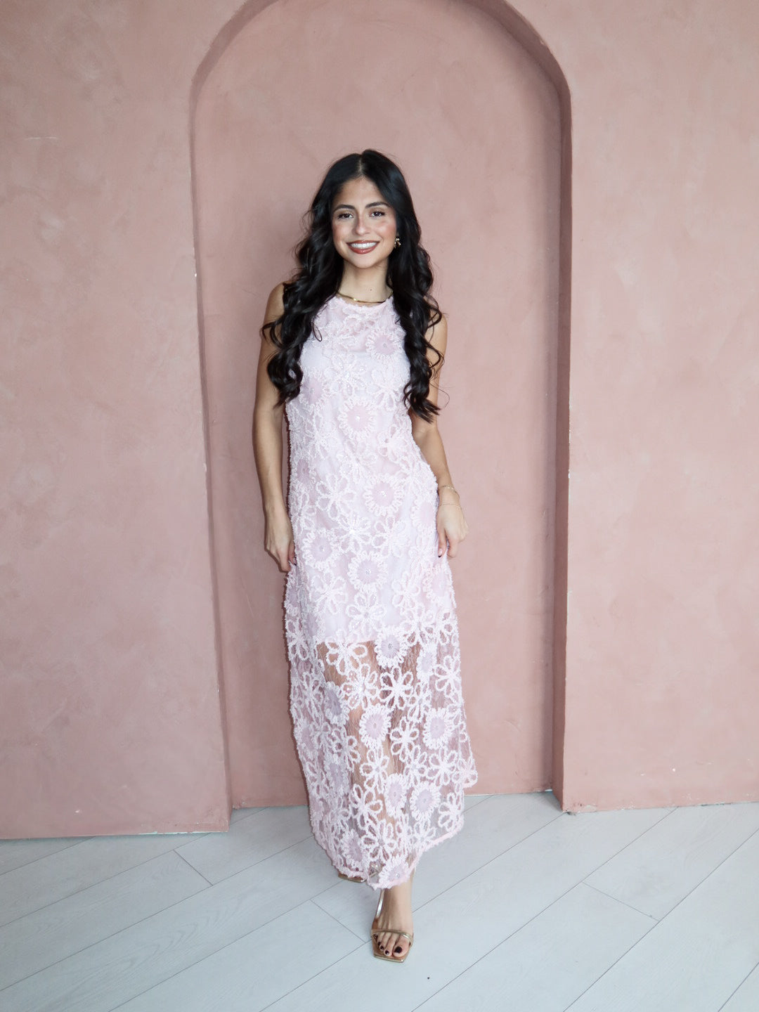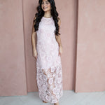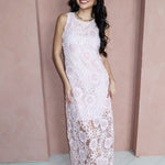 Soft, romantic, and made for special moments. The Blushing Petals Midi Dress features delicate floral lace embroidery layered over a blush pink base, finished with subtle sequin detailing that catches the light beautifully. Designed with a sleeveless silhouette and a refined midi length, this dress feels timeless yet effortlessly modern—perfect for weddings, showers, or any elevated occasion on your calendar.