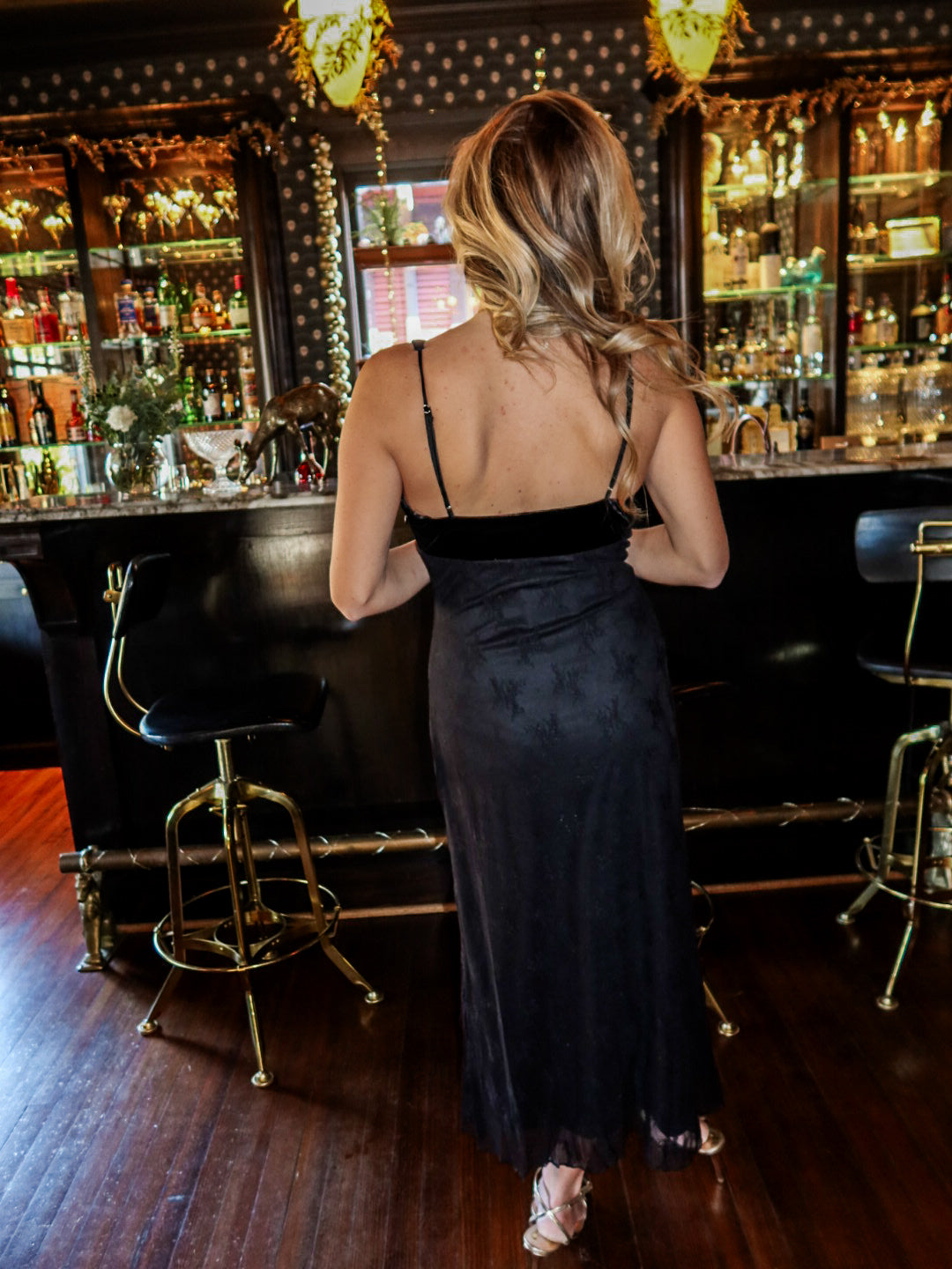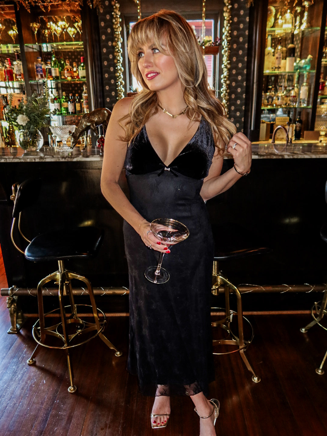 Keep it sleek with minimalist black heels and a simple earring, or add a glam clutch for a holiday-ready moment.