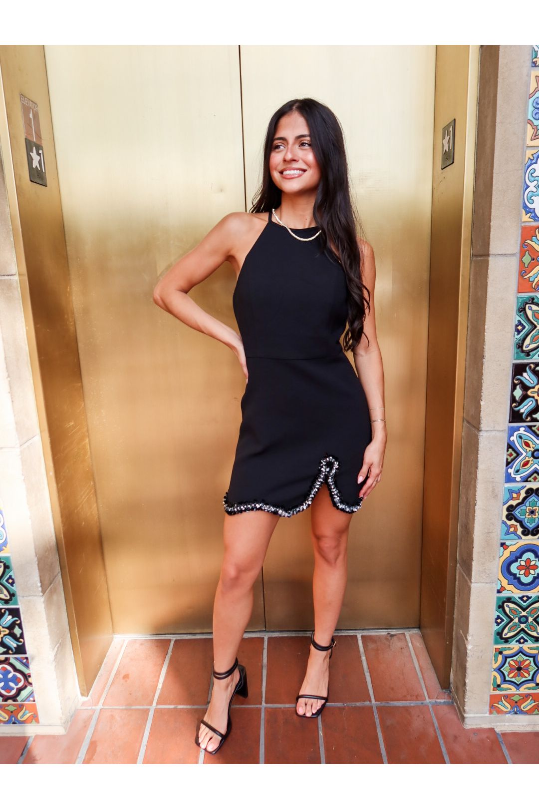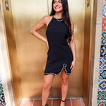 Simple, sleek, and just the right amount of extra. The Midnight Spark Mini Dress features a chic high neckline, flattering mini silhouette, and a crystal-embellished hem that brings the party with every step. Effortlessly polished and made to shine — this one’s a total head-turner.