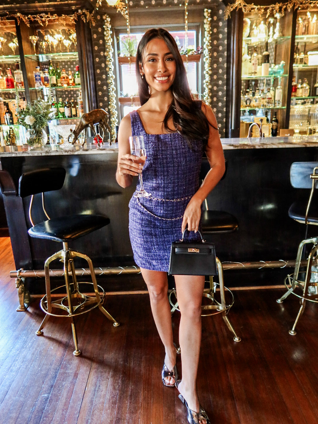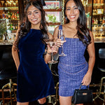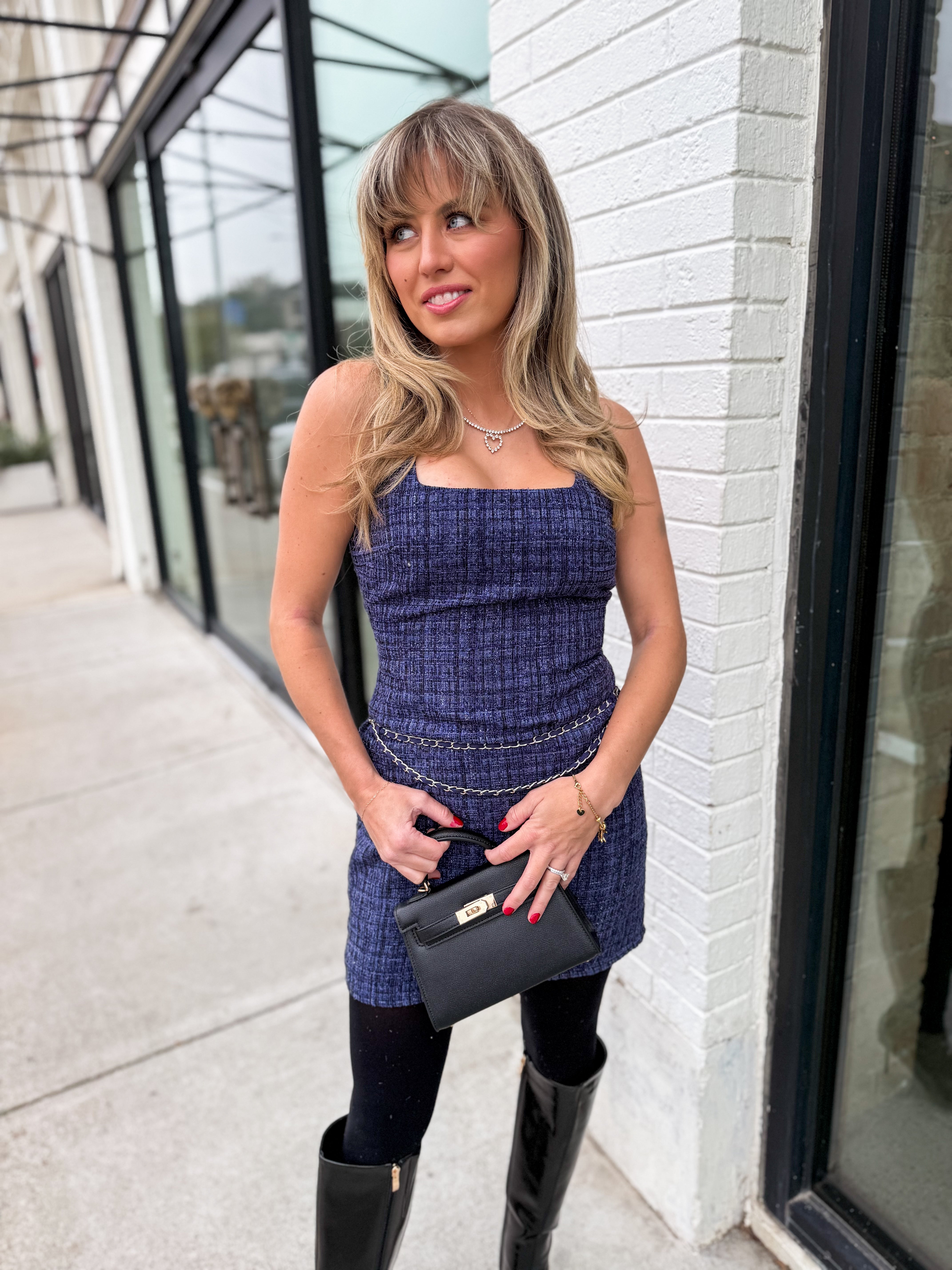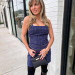 Chic, structured, and effortlessly polished. The Midnight Tweed Mini features a rich navy tweed fabric, a clean square neckline, and a flattering A-line silhouette that gives timeless-meets-trendy energy. The standout detail? A blue and silver chain belt attached at the waist, adding the perfect touch of modern edge to a classic tweed moment. It’s preppy, elevated, and made for holiday parties, dinners, and every stylish outing in between.