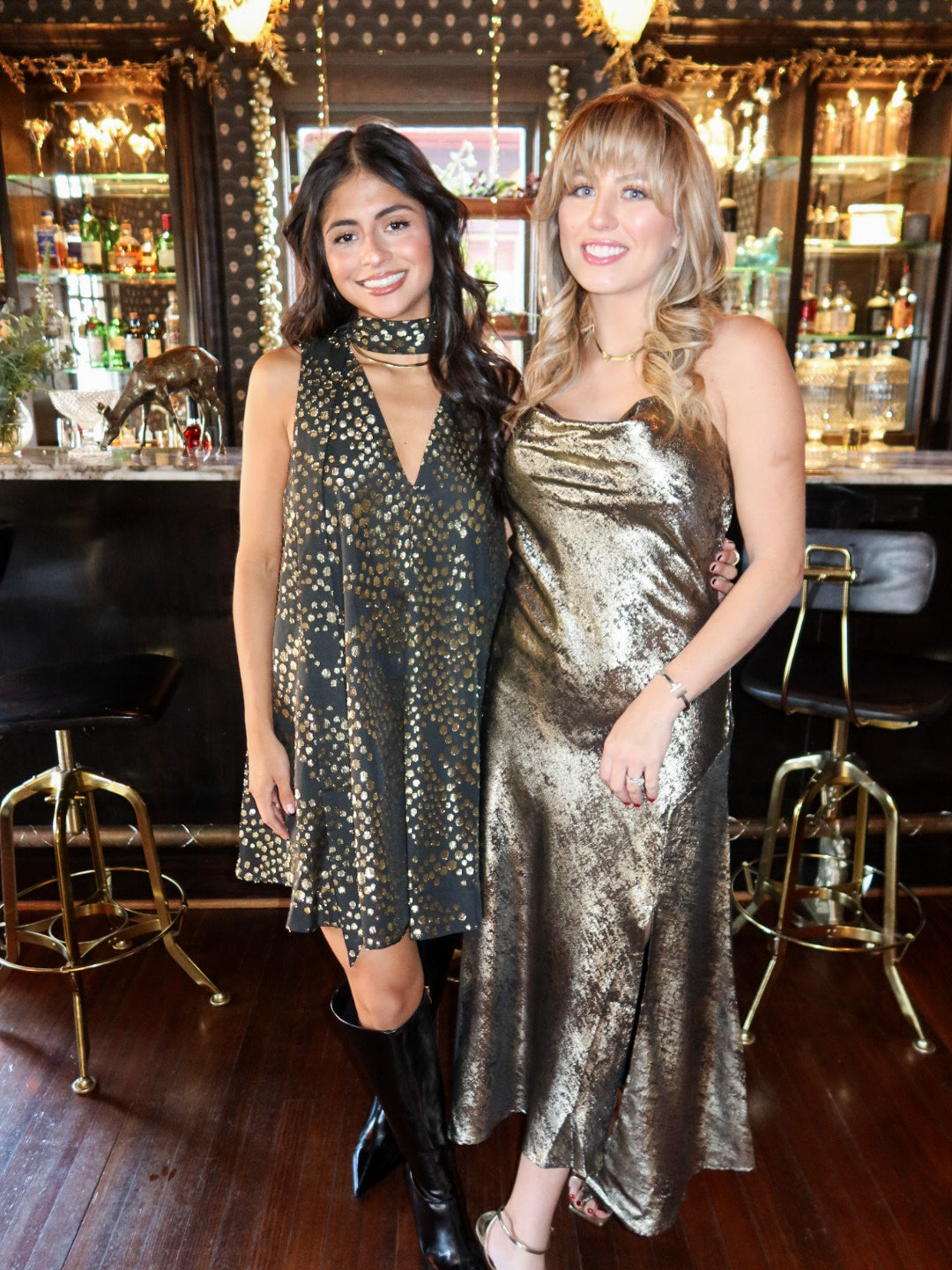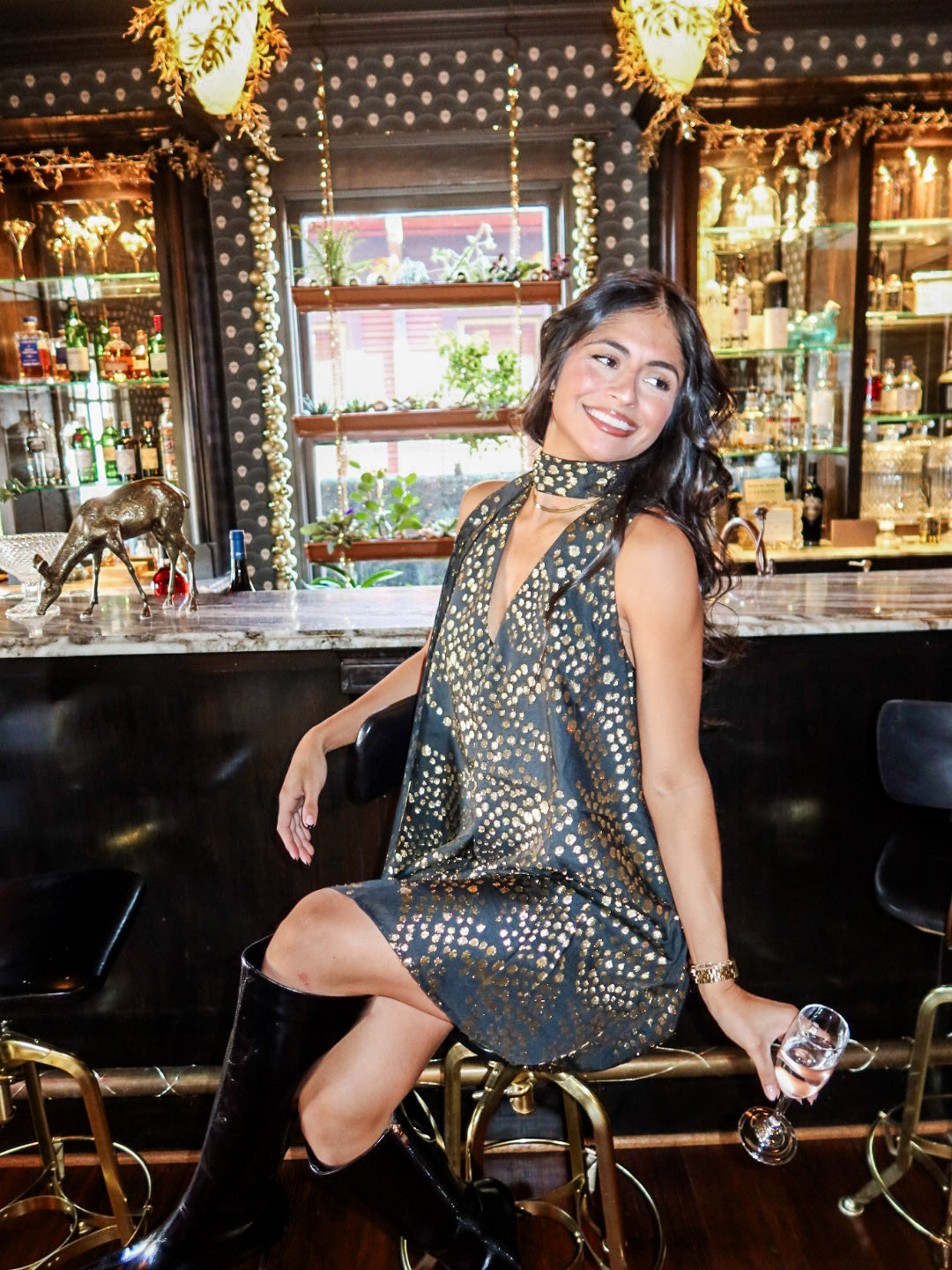 Let the dress shine — pair with sleek black heels and gold hoops for a polished, party-ready look.