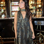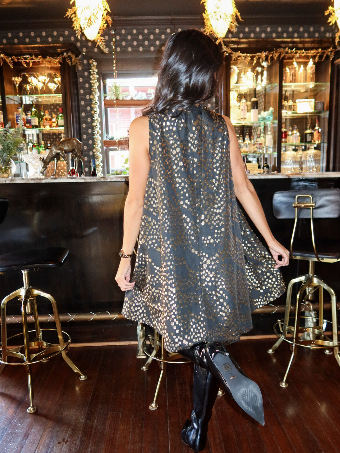 A little retro, a little glam, and absolutely unforgettable. The Monica Shift Dress by Lucy Paris features a bold gold-flecked print over a sleek black base, giving you instant party-ready sparkle with zero effort. The swingy A-line silhouette offers beautiful movement, while the chic mock-neck scarf detail adds a touch of high-fashion drama. Festive, flattering, and made for nights when you want to stand out.