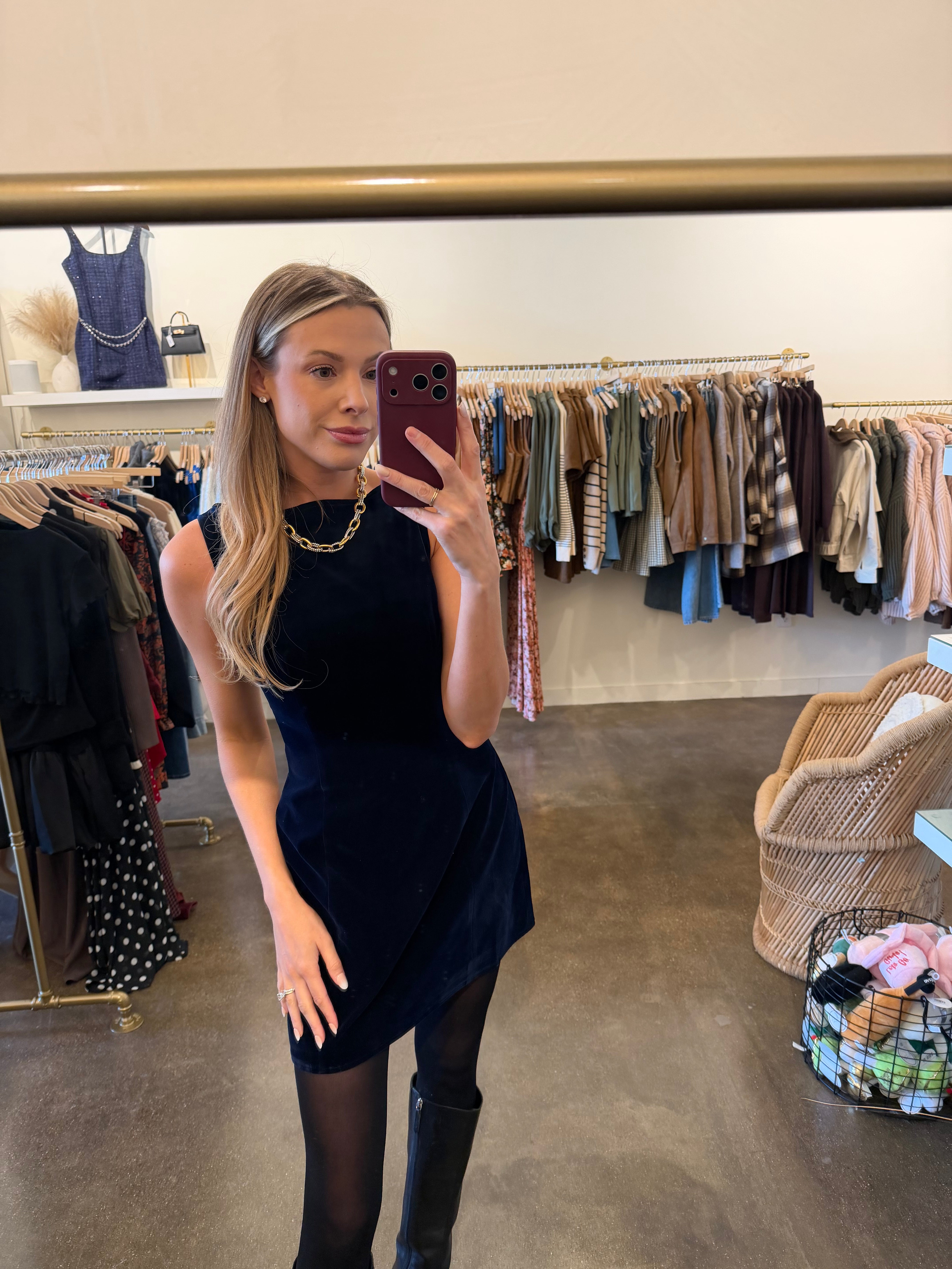 Meet the mini that understands the assignment. The Velvet Skyline Mini Dress features a sleek boat neckline, a tailored sleeveless silhouette, and rich velvet fabric that catches the light beautifully. With its clean lines and smooth hidden back zipper, this dress delivers timeless elegance with a modern, elevated finish. Available in deep merlot and classic navy — two shades that always look luxe.