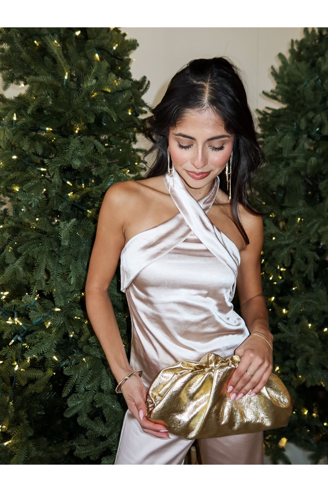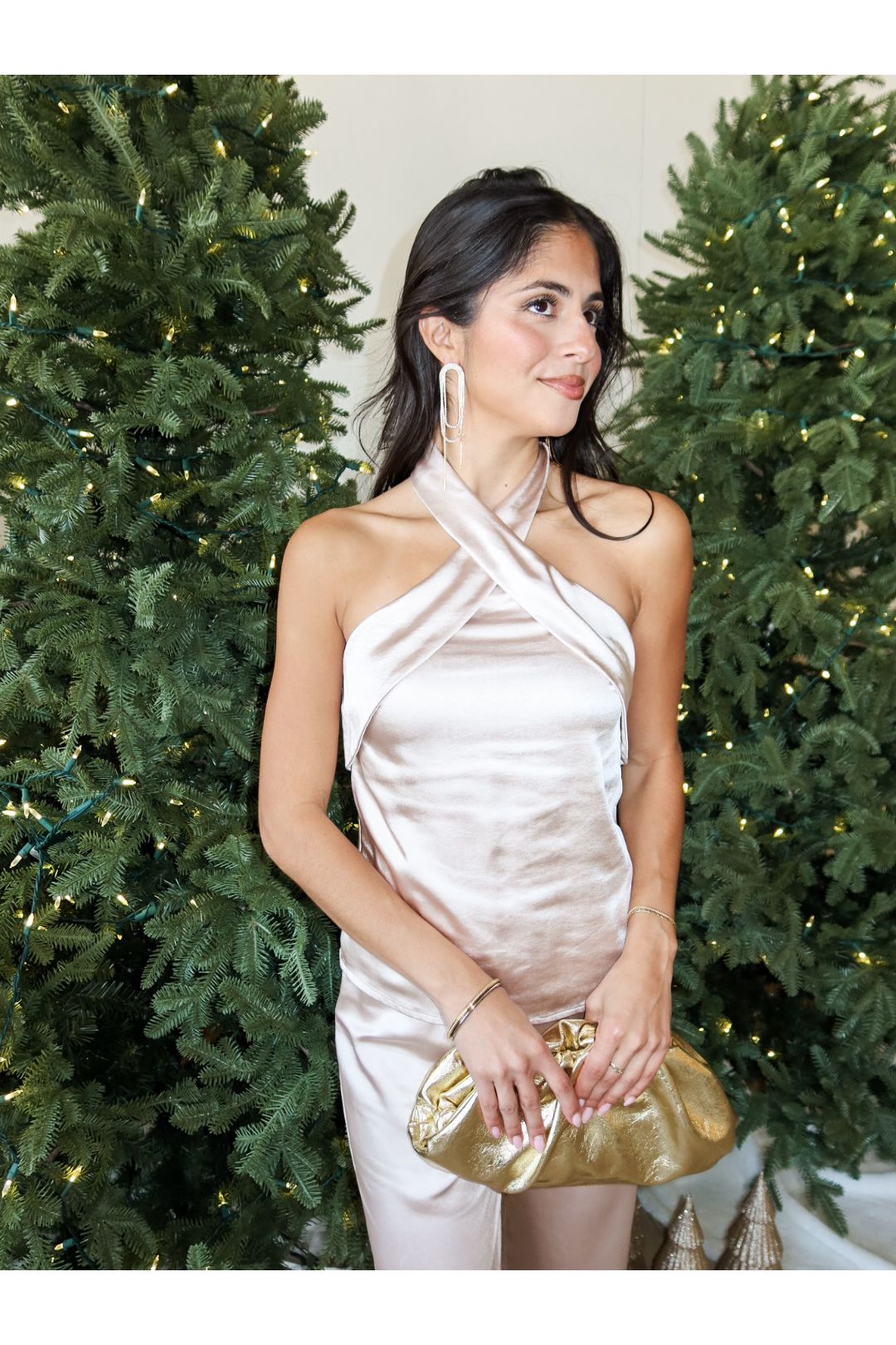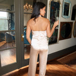 Polished meets effortless in the Satin Situation Set. This satin two-piece features a halter-style top with cascading neckline detail and matching flowy pants in a light taupe hue. Silky smooth and endlessly versatile, this set moves with you — whether it’s dinner with the girls or your next vacation night out.