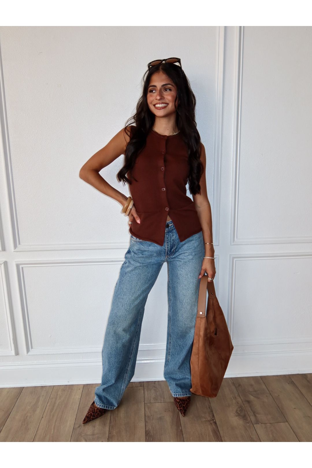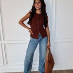 Polished, preppy, and a little bit posh—the Buttoned Up Vest is your sleeveless sweater upgrade. This fitted knit features a classic crew neckline, tonal buttons down the front, and cute mini pockets that add just enough detail. In a rich brown hue, it’s the layering piece you’ll reach for whether you're styling it solo or over a crisp button-down.