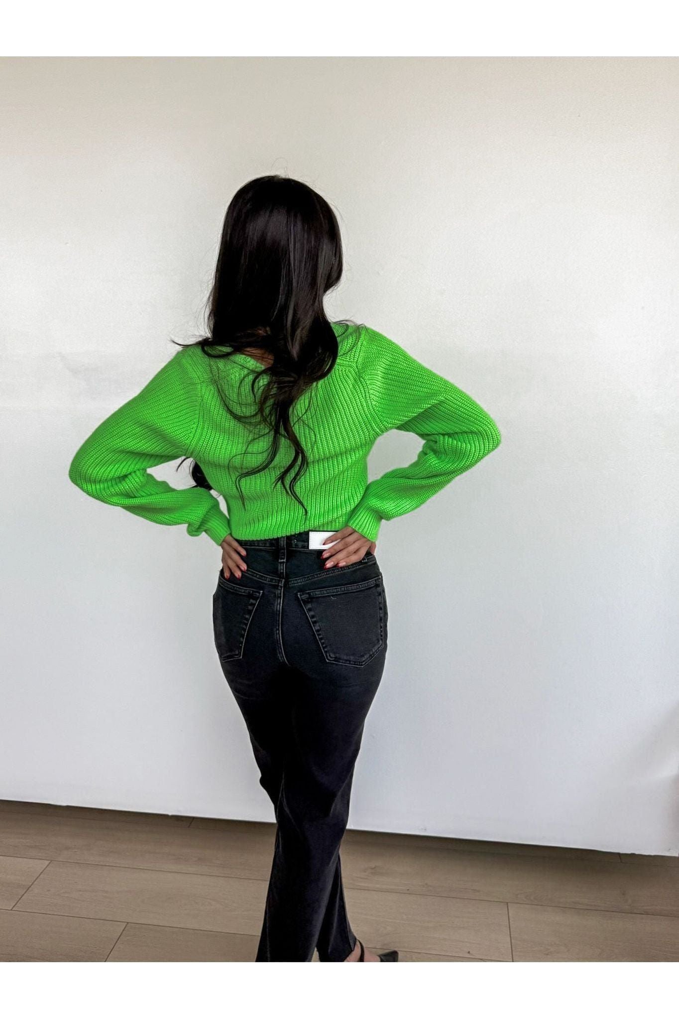 Brighten up your wardrobe with the Kia Sweater in fresh lime green! This lightweight, cropped sweater features a flattering square neckline and a soft, ribbed knit fabric for a sleek, modern look. Perfect for pairing with high-waisted jeans or skirts, the Kia brings a bold pop of color and effortless style to any outfit.