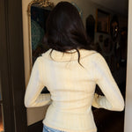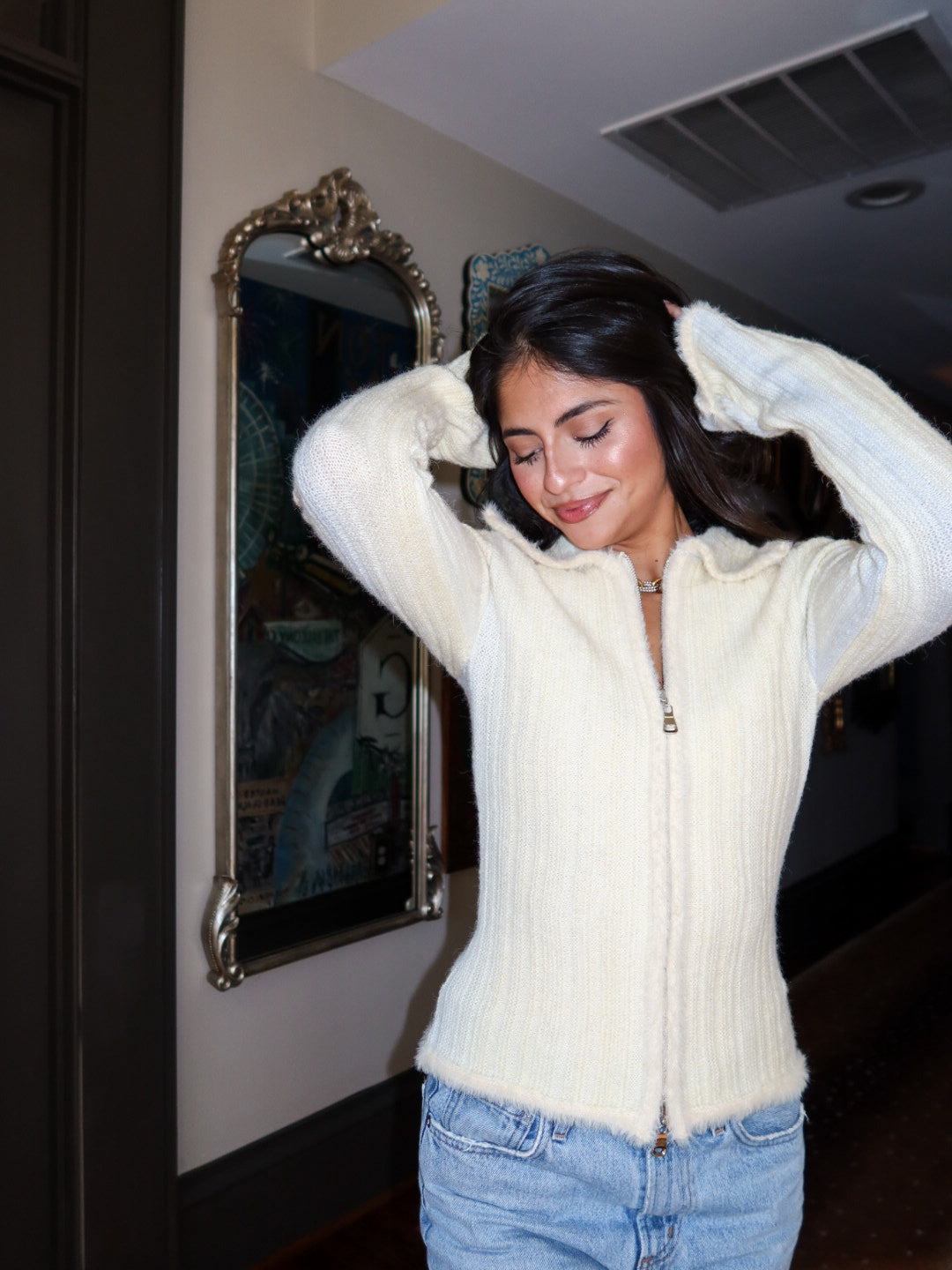 Meet your new layering obsession. This butter-yellow zip sweater top blends a sleek, sculpted silhouette with soft, stretchy knit comfort. With its subtle collar, clean seam detailing, and fitted shape, it’s the perfect “elevated basic” for denim days, office hours, and dinner plans alike.