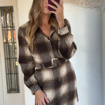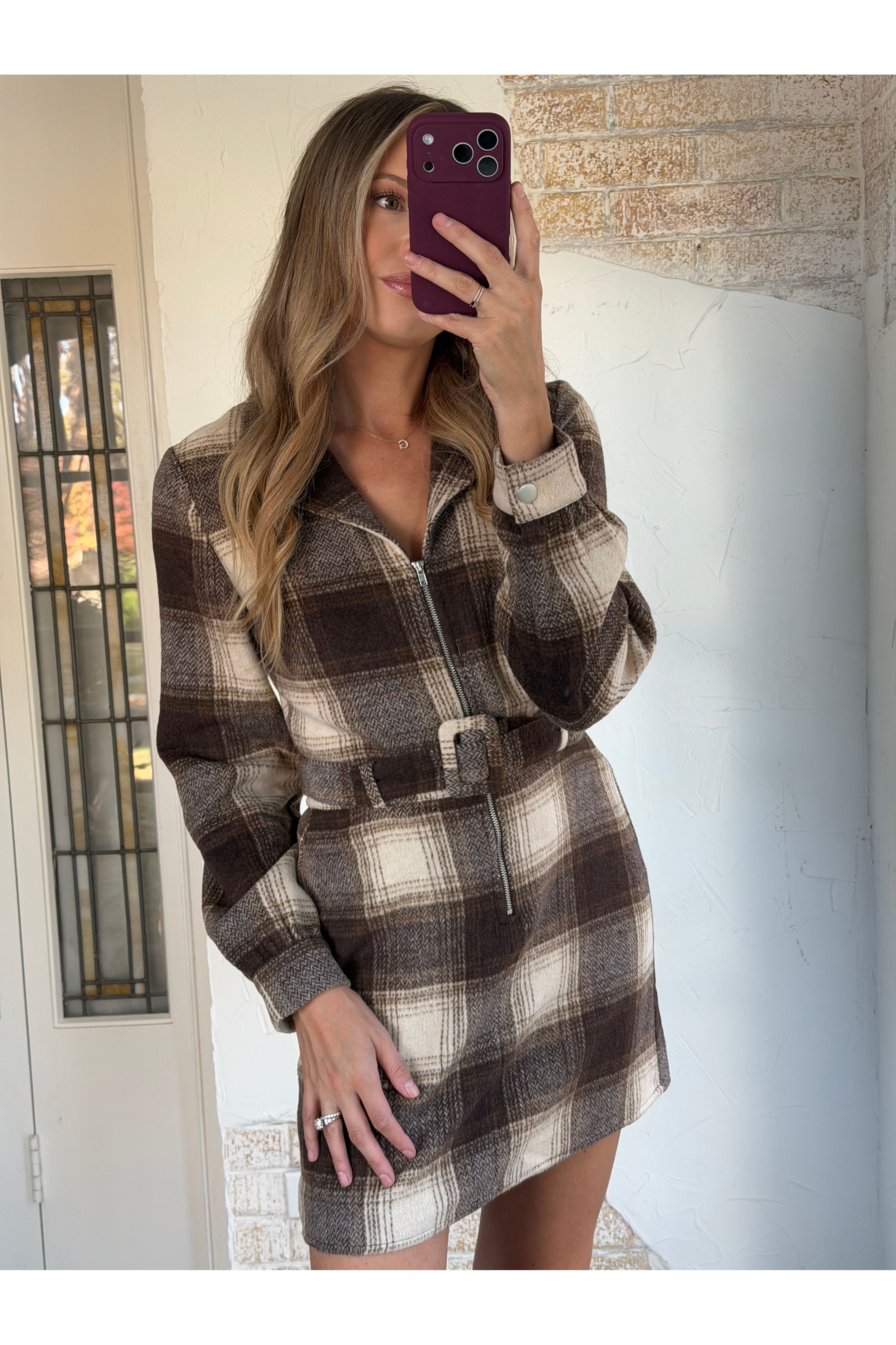 A little preppy, a little flirty, and totally effortless. The Check Yes Mini Dress features a cream-and-brown plaid vibe with a functional front zipper and a waist-defining belt that pulls everything together. Structured but comfortable, this mini is your new go-to for fall outings, coffee runs, or casual nights out.