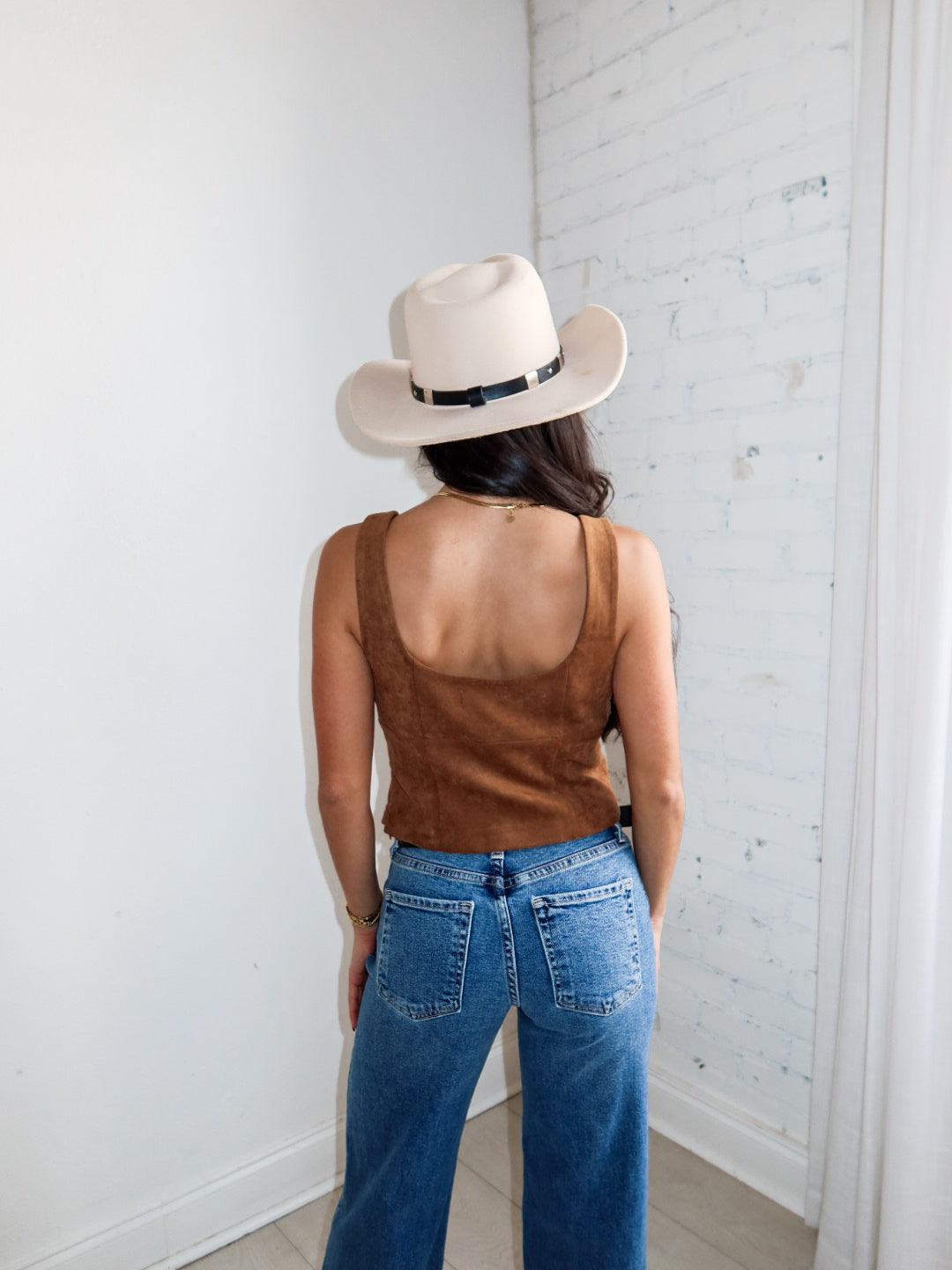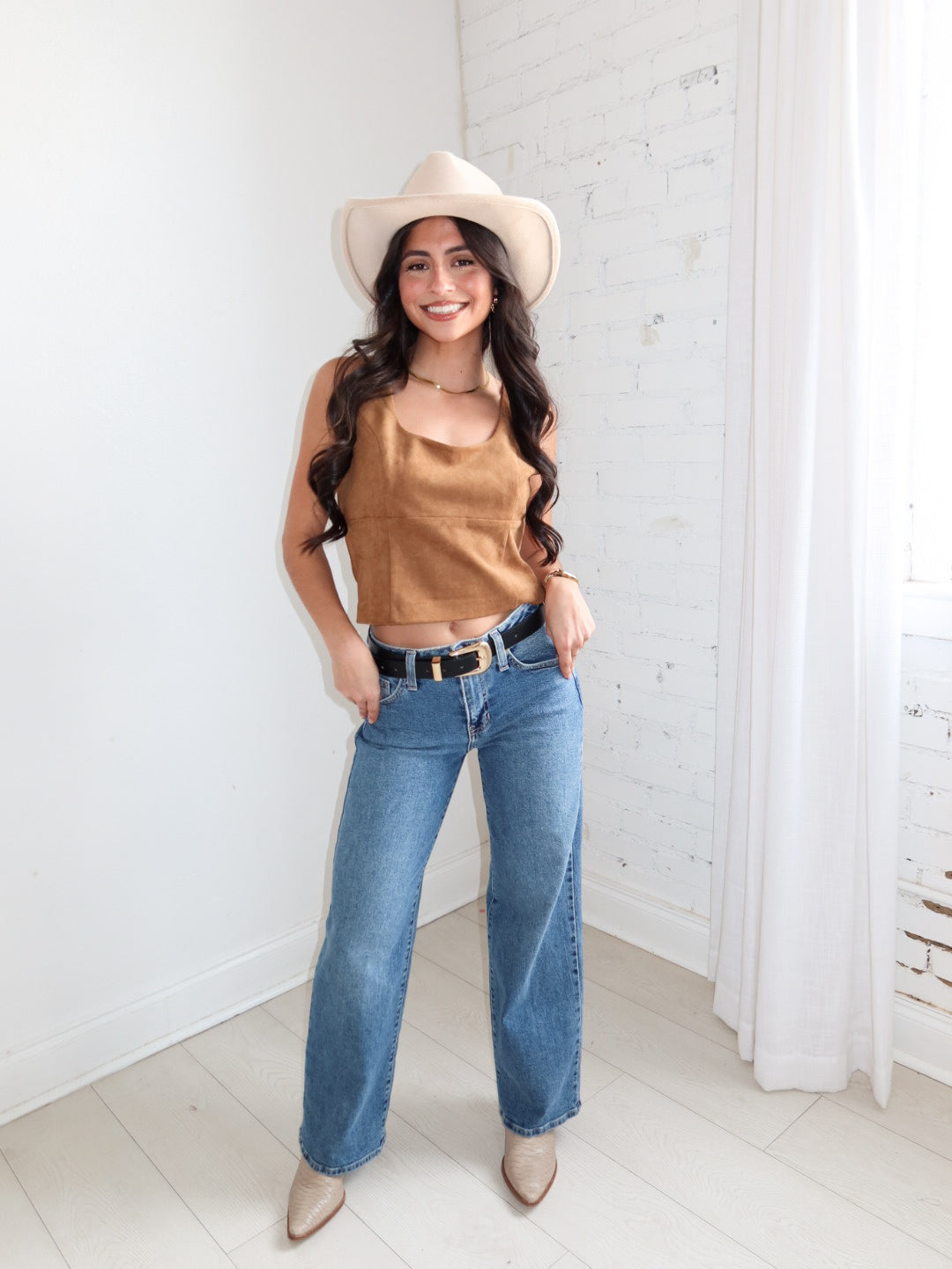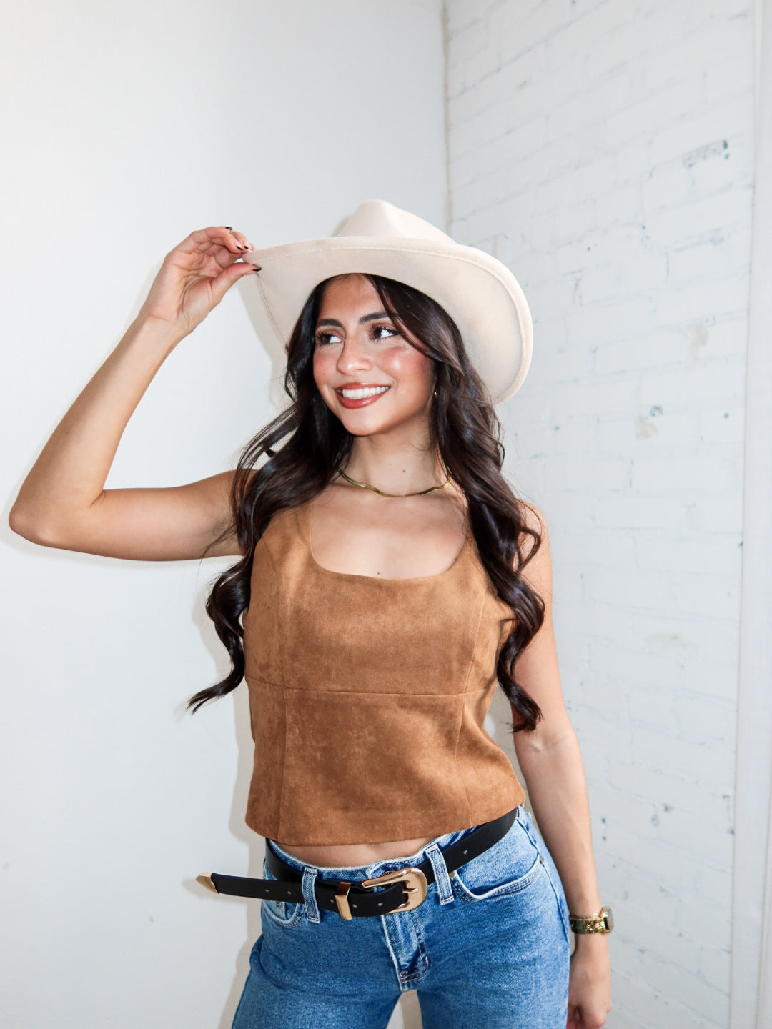 The kind of top that makes jeans look intentional. The Sloan Suede Top features a soft suede finish in a warm tan hue with a flattering scoop neckline and structured seams for a perfect fit. Sleek, sculpting, and surprisingly comfortable — it’s your new go-to for layering or wearing solo.