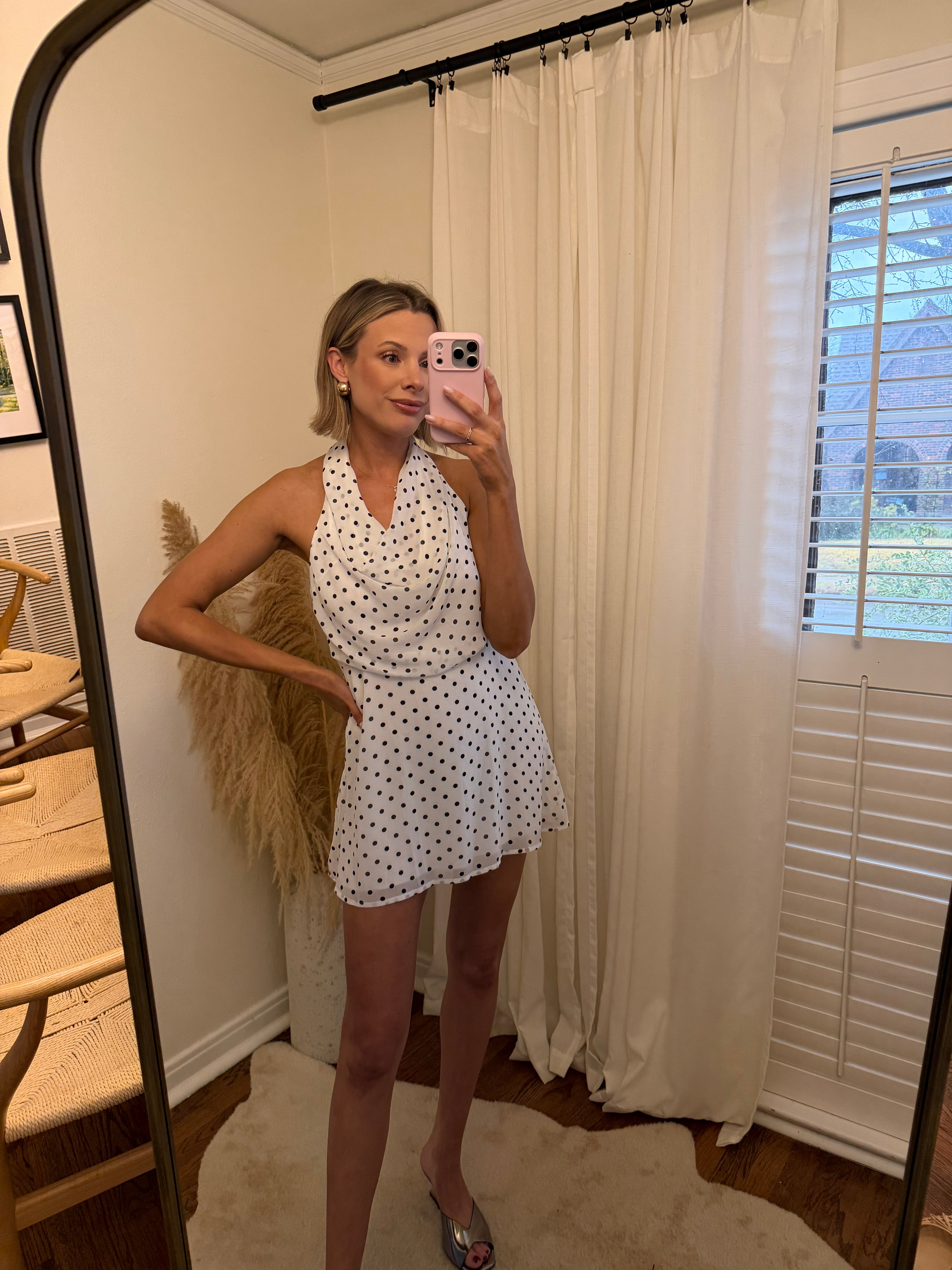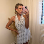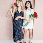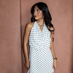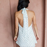 A little retro, a lot irresistible. The Seeing Spots Mini Dress features a classic black-and-white polka dot print with a soft draped halter neckline and an open back that brings just the right amount of drama. Lightweight and flowy, this mini is made for warm nights, rooftop cocktails, and spontaneous plans.