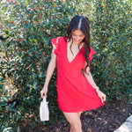The Crimson Crush Mini Dress features a V-cut neckline with red lace trim and a flowy silhouette—lightweight, feminine, and perfect for nights out.