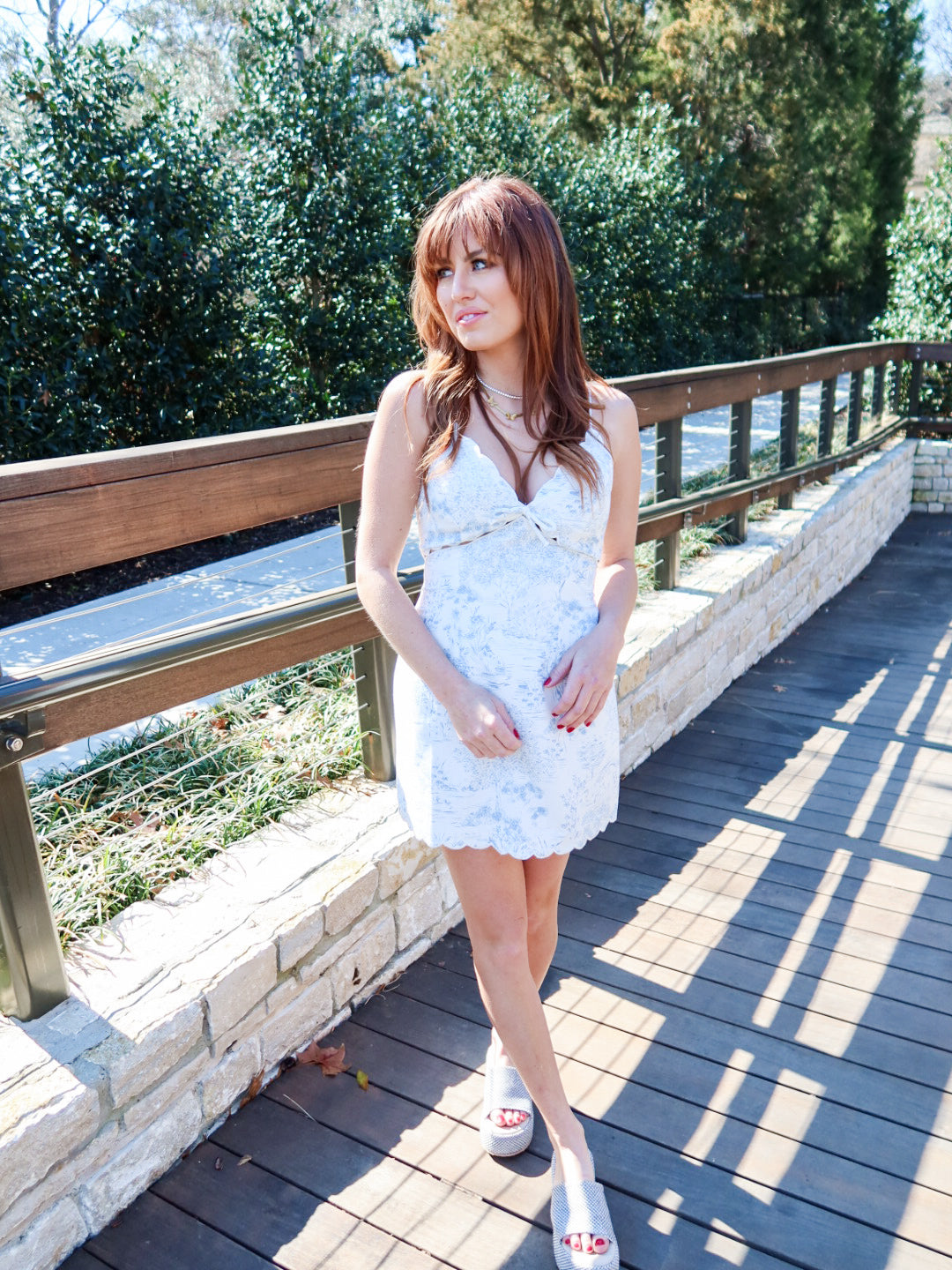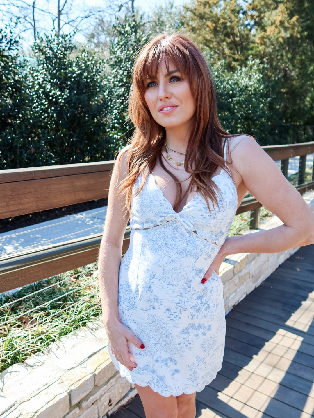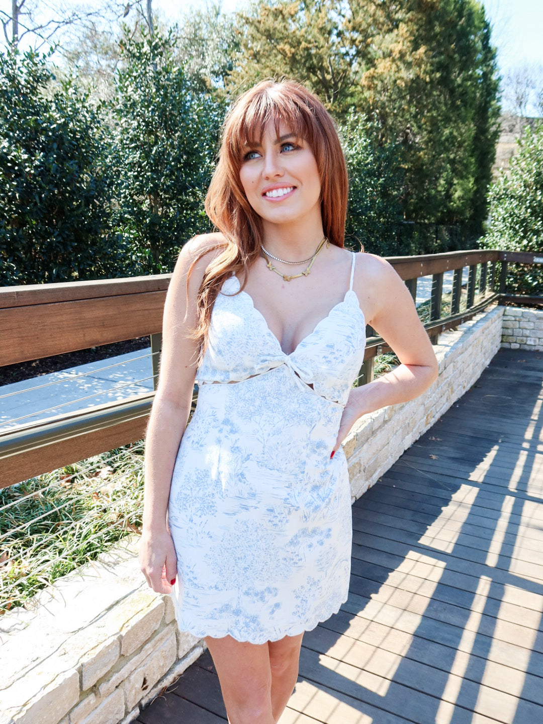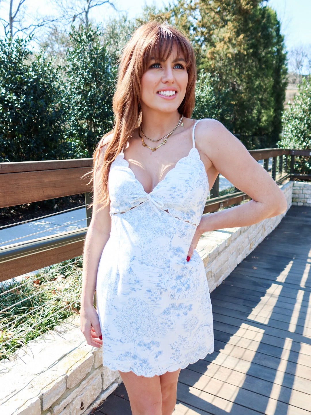 Romantic, feminine, and effortlessly pretty. The Sweet Scallop Mini Dress features a delicate cottage-inspired print with a flattering V-neckline finished in soft scalloped detailing. Designed with thin spaghetti straps and a breezy mini silhouette, this dress feels light, polished, and easy to wear.